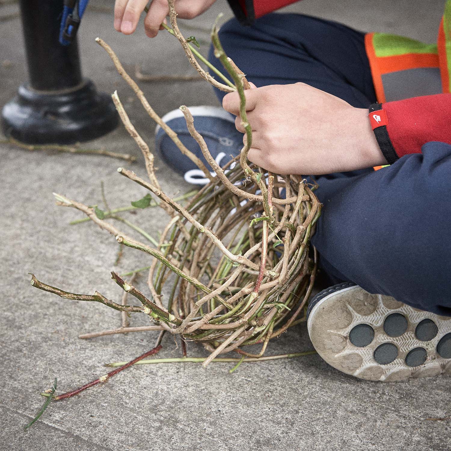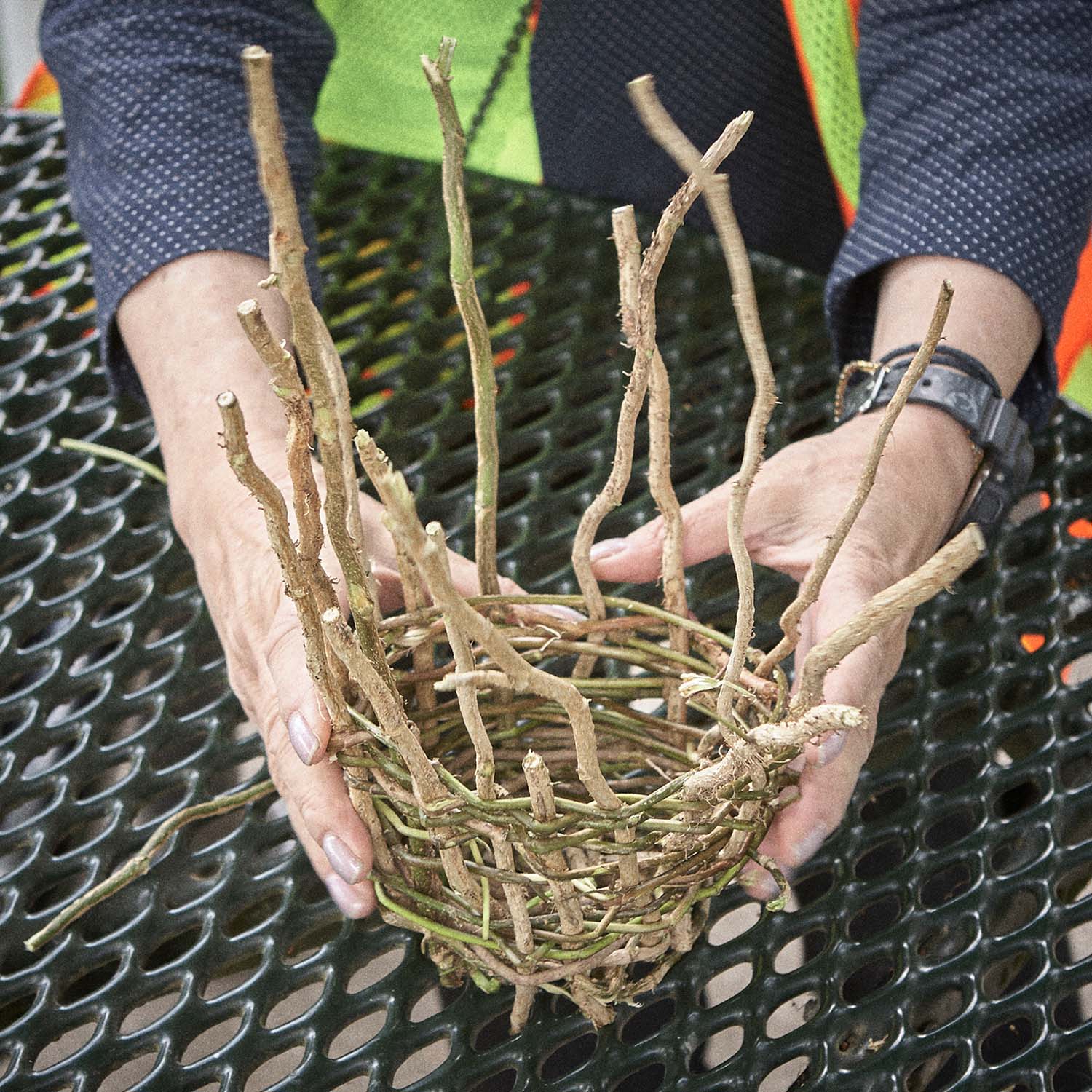 As part of this project, she led workshops in tea making and in basket weaving, using vines of English ivy. She also led a plant walk around nearby Minoru Park. All of these workshops were incorporated into the piece in some way: The ivy became the inspiration for her final mural design, some staghorn sumac leaves she picked during the plant walk were tucked into the vines of the piece, balls of wool that she dipped into tea from the workshop became olive-coloured berries on the mural.