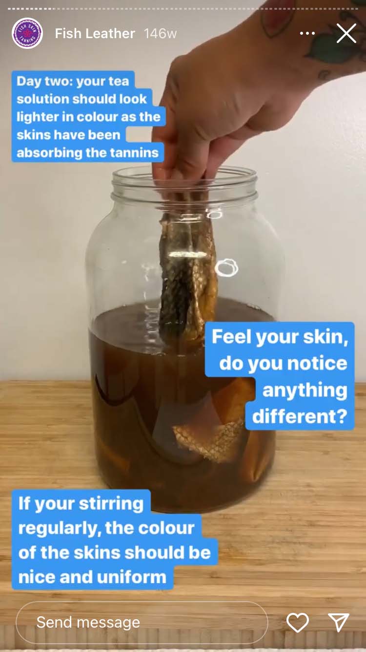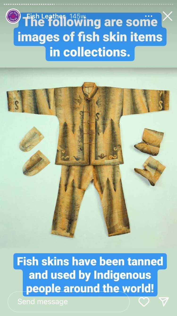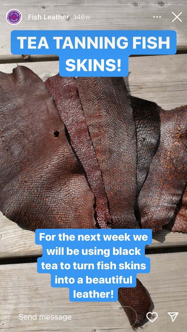 Moose hides, deer skins, a bear pelt – all of them found their way onto the nine-by-nine-foot balcony of the Anishinaabe artist, hide tanner and conservationist. And in the kitchen of her small downtown Toronto apartment, she transformed scaly salmon skin – still with bits of flesh on it – into smooth, supple and flexible fish leather. The key ingredients (as seen on her @ambsandy Instagram highlights): leftovers from a sushi shop, salt, dish soap, cooking oil and many, many bags of Red Rose tea, to provide the actual tannins for tanning. The chemical compound helps retain the collagen in the fish hide to keep it strong and long-lasting. Basically, it’s what makes leather, well, leathery.