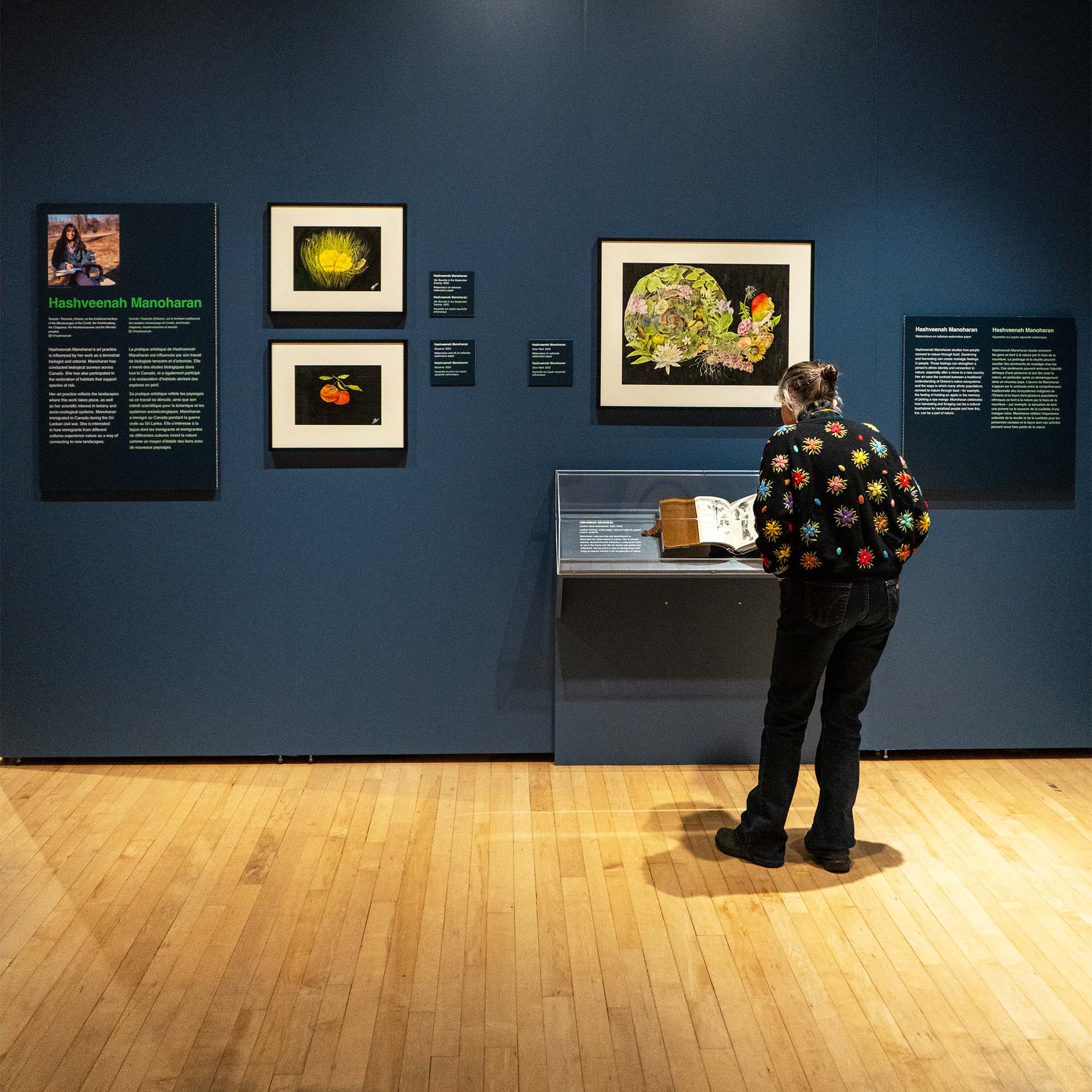 Care is a recurring theme of the exhibit, as evidenced by the detailed nature sketches and colourful paintings contributed by Hashveenah Manoharan. They’re part of her “slow walk” series, which was very intentionally named with inspiration from the queen of nature poetry, Mary Oliver. Manoharan sees a slow walk as the simplest way we can all start to pay attention to and respect and care for nature. She uses the example of snakes, which (like many people) she used to fear. “I had no interest in overcoming [my] fear of snakes until I started working with and living among them,” she says. “They are emblematic of what attentiveness can do for our relationship to nature: once I started to seek them, I was able to appreciate them, and thus emboldened to work to protect them. This procedural advancement from attentiveness to respect to care is a powerful pipeline – one we all have the capacity to undertake, beginning with a slow walk.”