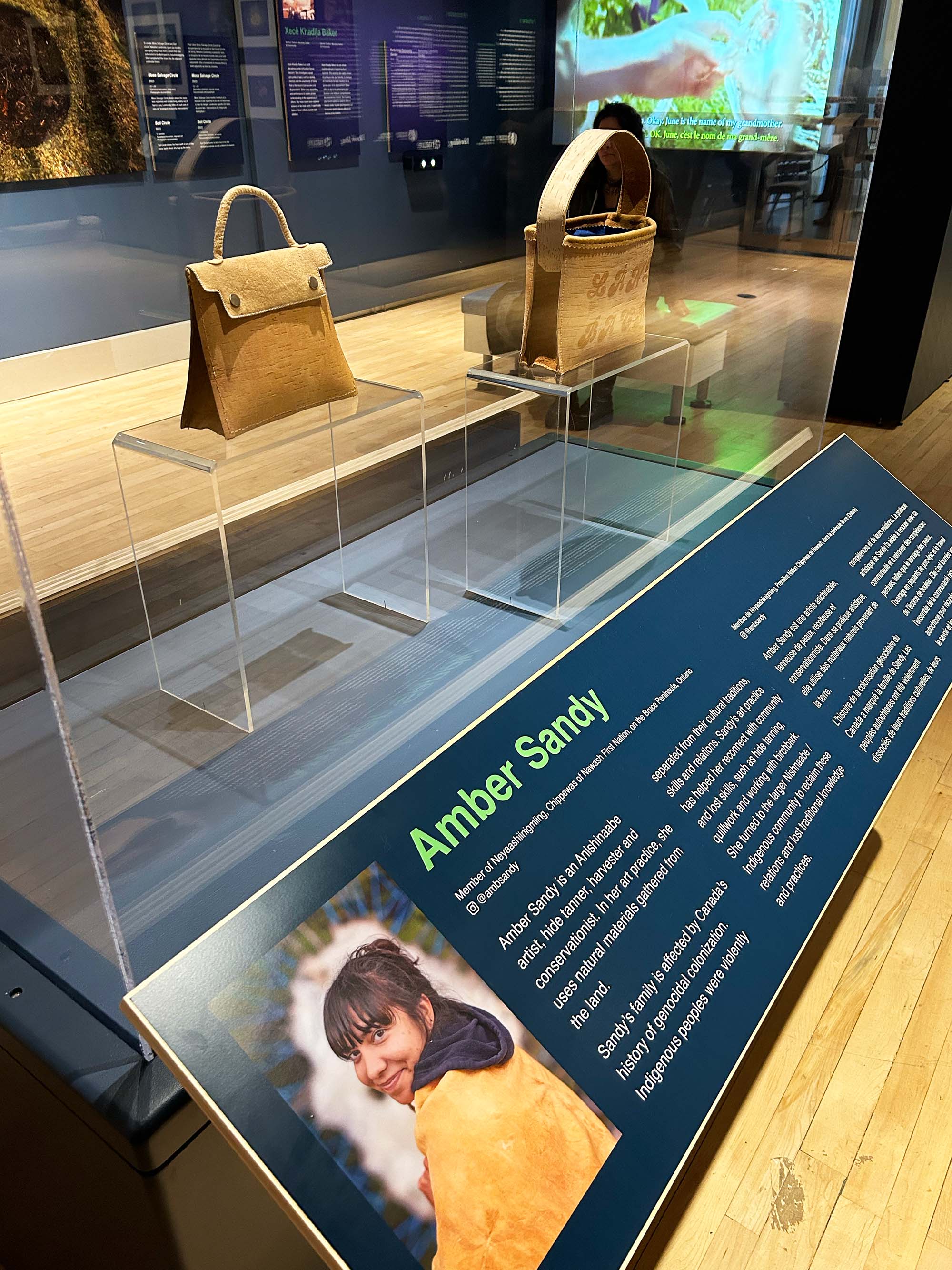 Scenes from the exhibit. Clockwise from top left: A visitor examines a sketchbook by Hashveenah Manoharan; photos of two of Natasha Lavdovsky's moss-related works; a close-up of Cole Swanson's gold-coated insects; Amber Sandy's birchbark purses. Photos: D. Steed.