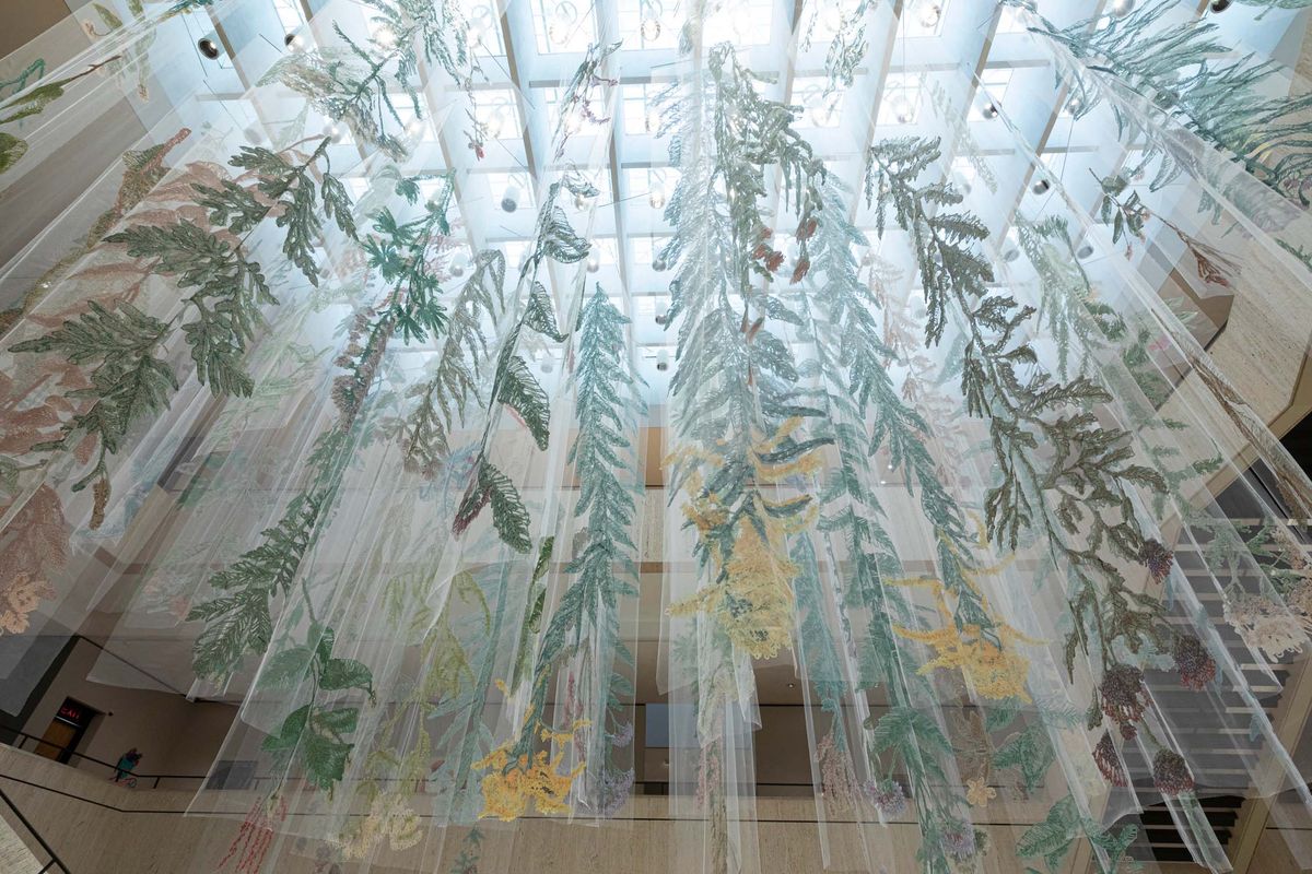 That’s thanks to the artists, each of whom approached themes of nature and rewilding in their own way. But it’s with a collective energy that the exhibit came together. In this spirit, throughout the year, interactive components will be offered for museum visitors, starting with an opportunity to craft their own tapestry à la Angela Marsh. Marsh uses fragments of wild plants found in abandoned urban lots and weaves them through bubble-wrap with painstaking detail. Don’t worry: the DIY version offered to visitors won’t take as long to complete.