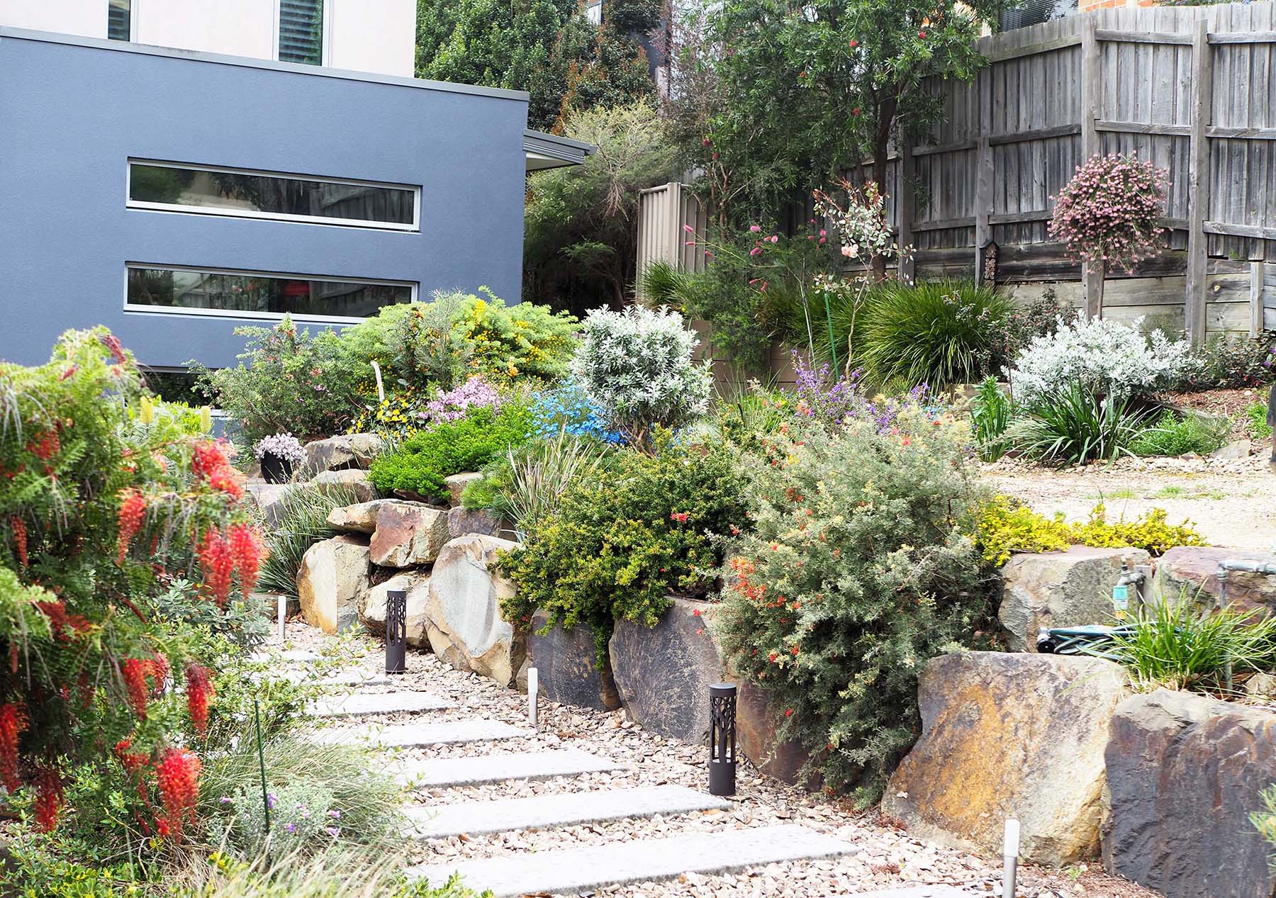 I wanted to make sure I had indigenous plants here, as well as the general natives. I also think about flowers through the seasons. I like having things happening across the year, so the birds and insects always have something to come to. And I love the colours, the greys, the greens, the pinks, and how they all work together when you look out from the house.