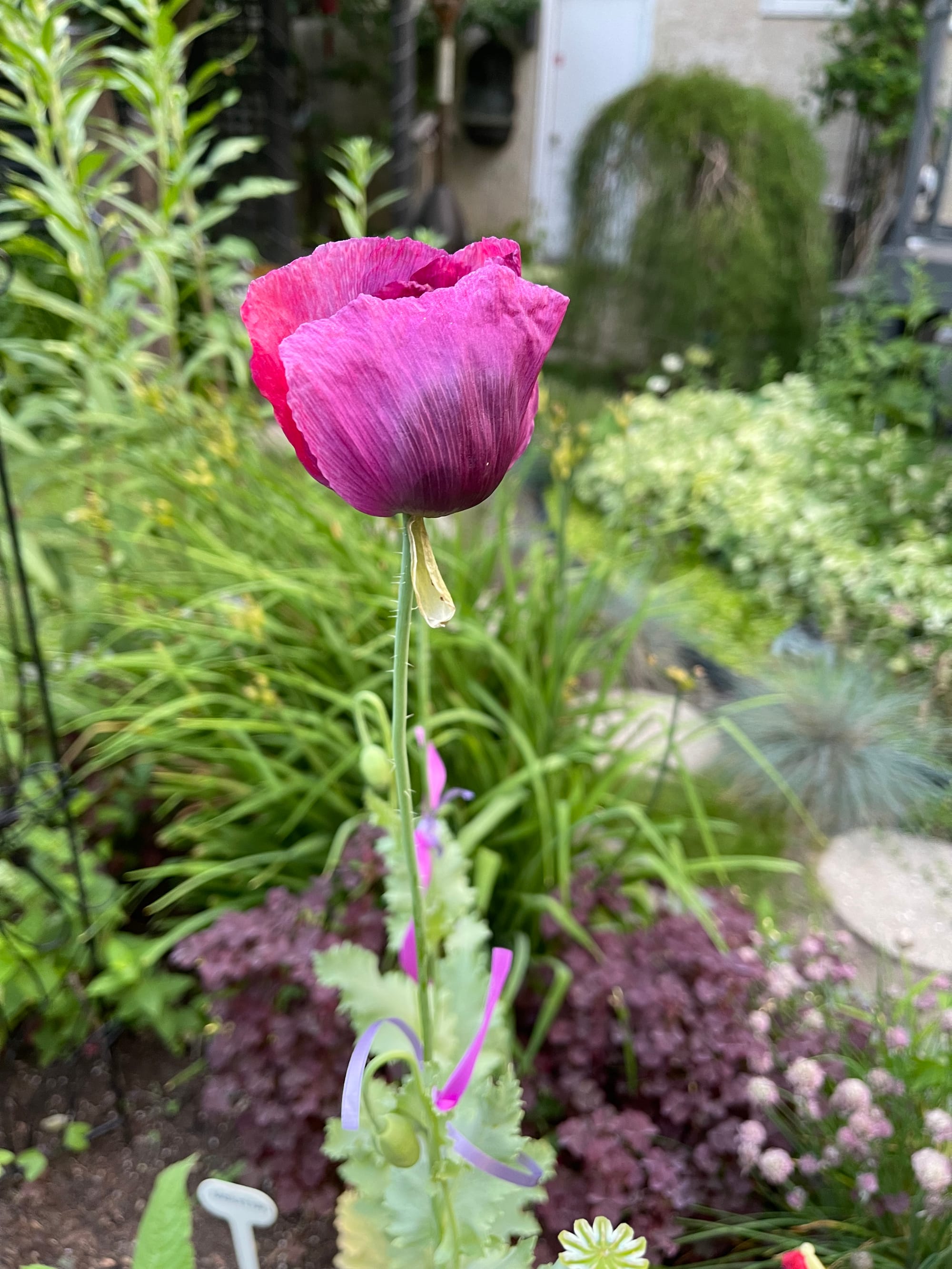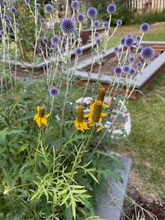 Left: A purple poppy marked with purple ribbon to identify the seeds. Centre: A 2024 circle of wildflowers for the Butterflyway Ranger program. Right: prairie coneflower and echinops. Photos: Karen Hunter.