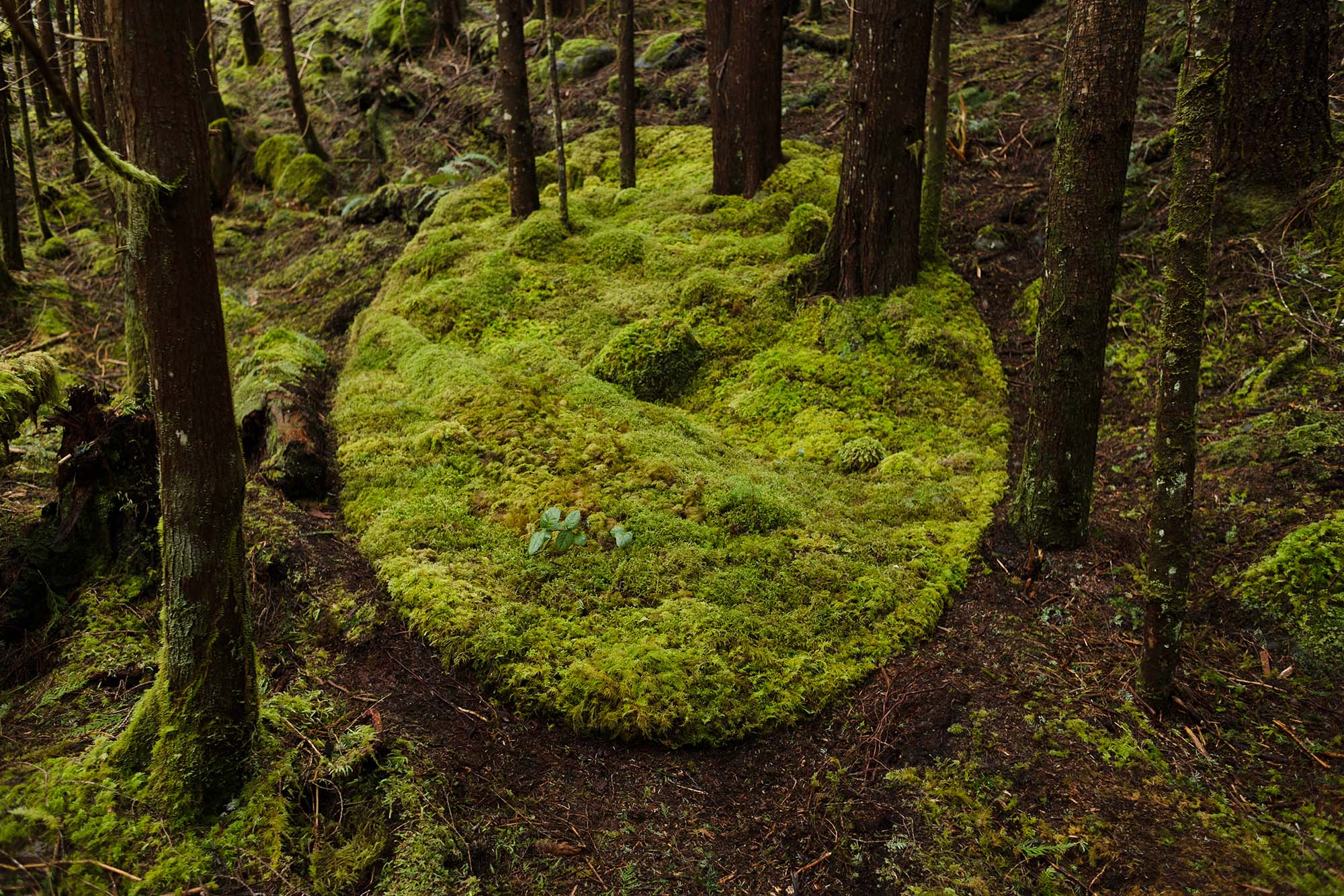 In 2013, Lavdovsky carried the frame of the chair, stripped of its foam and fabric, into the forest and rebuilt its form using dirt and moss from the surrounding environment. Within a couple of years, huckleberry plants and a baby spruce were growing out of the chair’s back. “There’s an element of welcoming you back to the comfort of connecting with the forest as an extension of your home,” she says of “Moss Chair,” which remains in its place today.