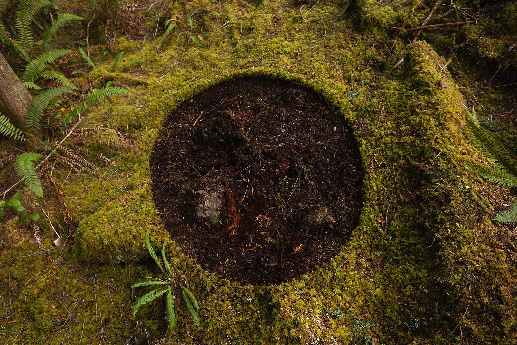For Lavdovsky, she’s exploring these concepts as her artistic practice evolves, and these days, she’s more focused on ways to engage with the land through reciprocity and active care. For example, in 2021, in an area near Fairy Creek on Vancouver Island that was slated for clear cutting, she did a field survey to collect data on the presence of the rare oldgrowth specklebelly lichen. For another recent piece, Moss Circle, she rescued moss from a site of impending logging, transplanting a total of about 30 square metres of the shade-loving plant along with salvaged soil to a riparian reserve zone 100 feet away. “It looks like this damaging act against moss,” she says. “But actually, I’ve moved the moss into the forest to keep it living.” (She took GPS coordinates at the place where she’d peeled up the moss and returned post-clearcut to find the land unrecognizable.) It’s an inherently hopeful act: art rooted in looking forward and attempting to preserve what’s worth saving.