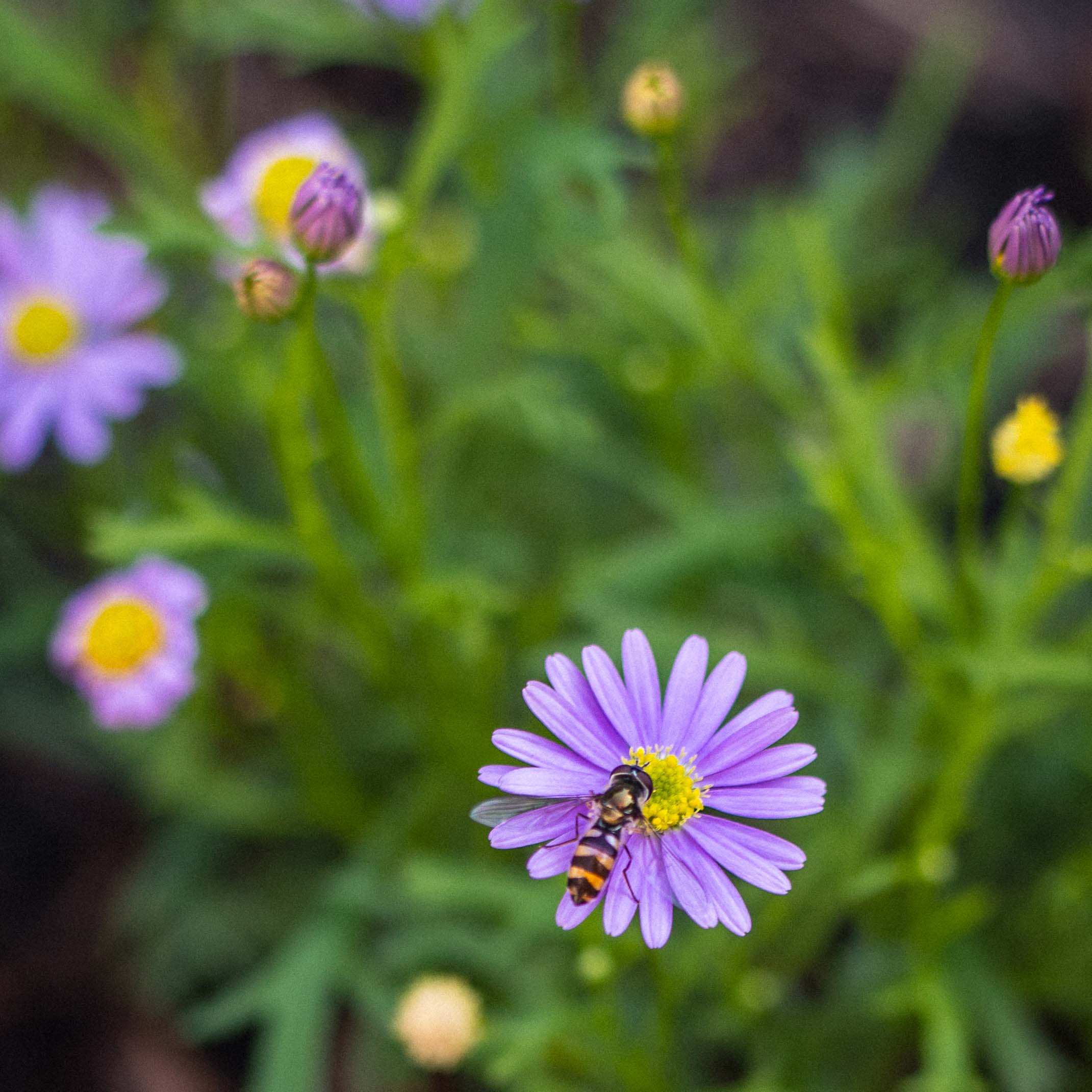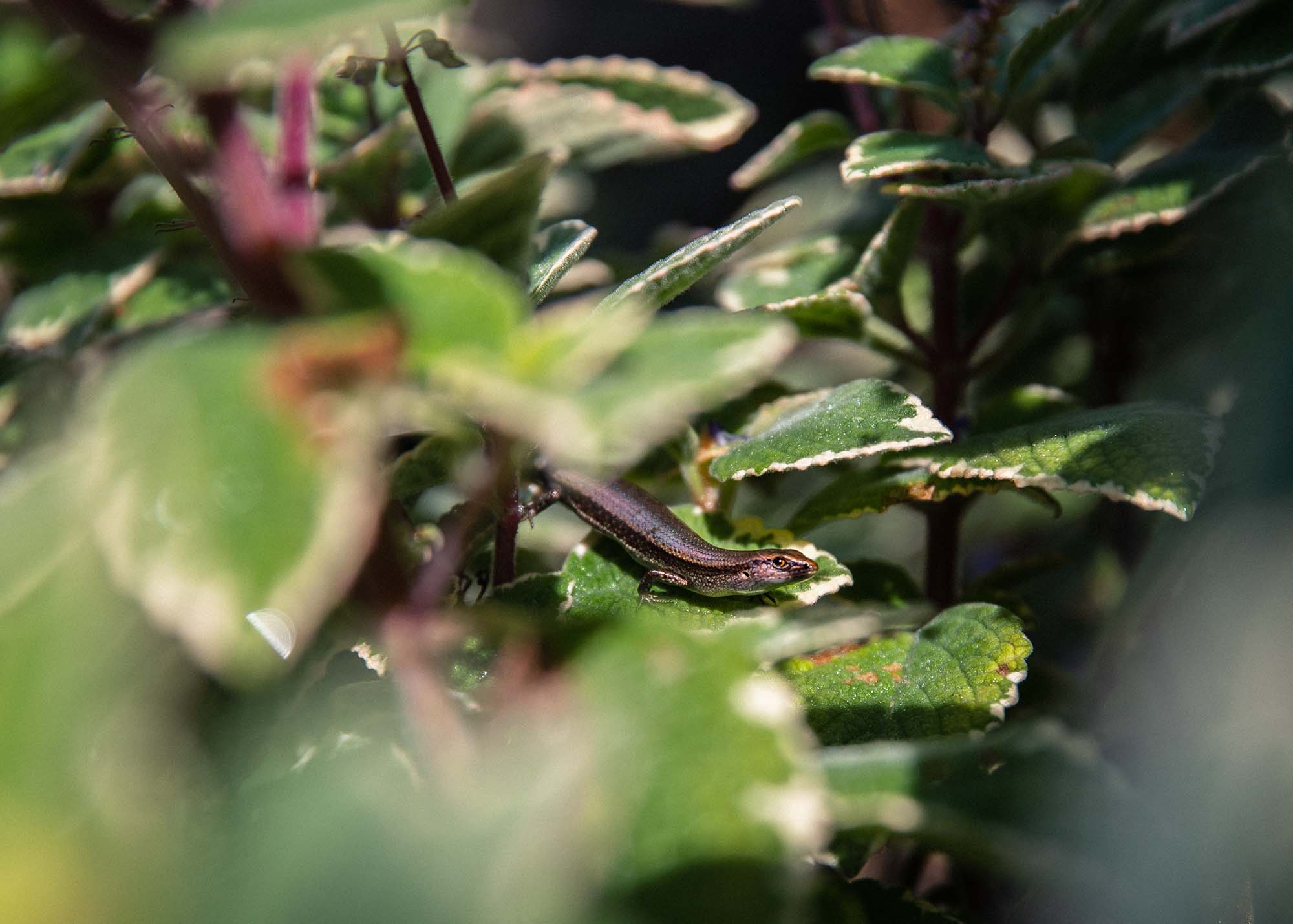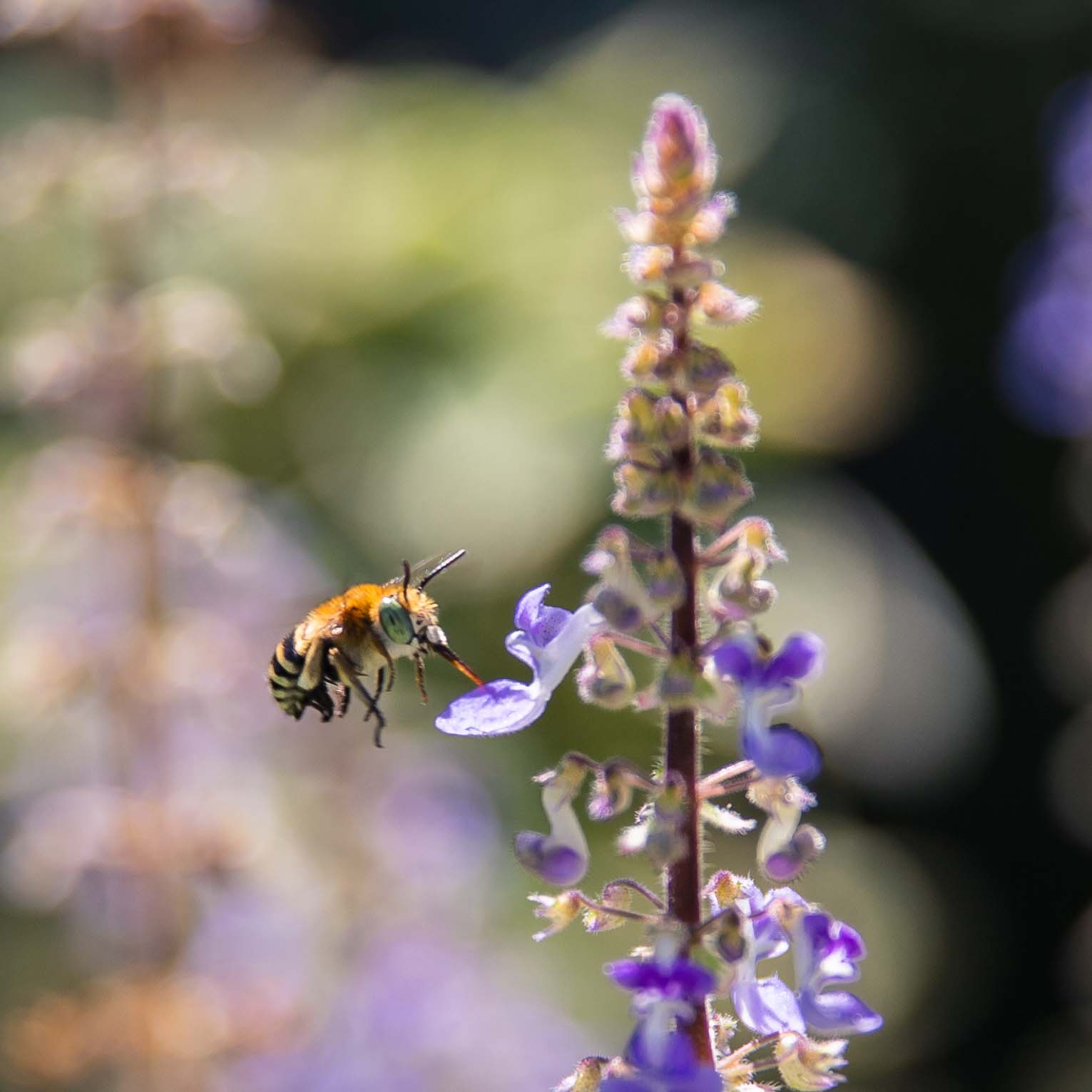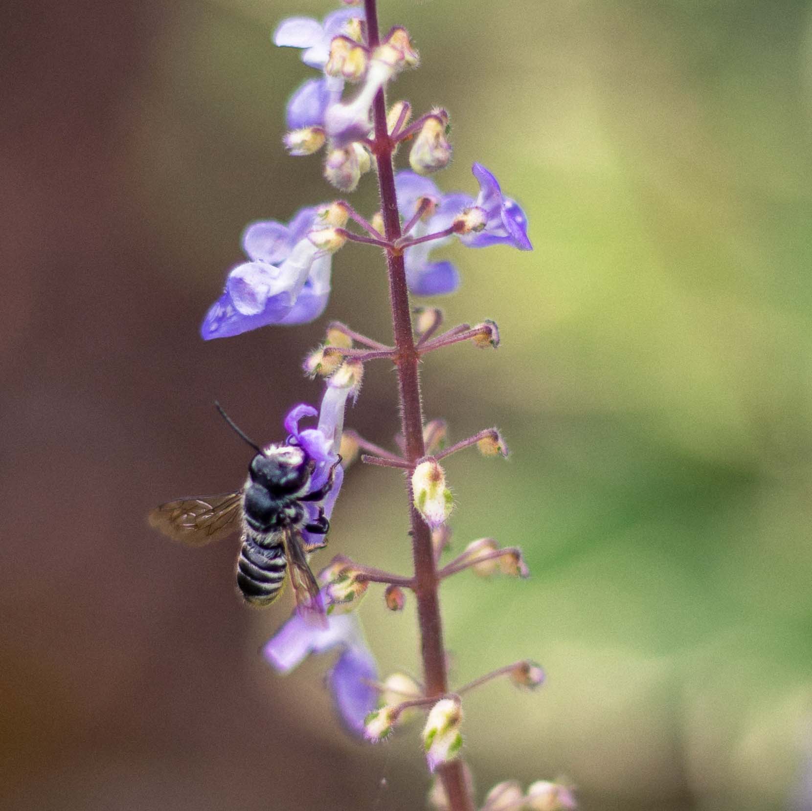 Pratia and native violets crept across the ground, and with them came tiny beetles and Tetragonula – our native stingless bees. The blue spires Plectranthus argentatus took over the corner behind the greenhouse and became a hub of activity. Blue-banded bees (Amegilla cingulata) and Megachile leafcutter bees feasted on the flowers, while silvery moths sheltered under the broad leaves. Their caterpillars chewed through them, only to be snapped up by noisy miners or the skinks that dart through the undergrowth. I started seeing a tiny food web in motion, all centred around one plant.