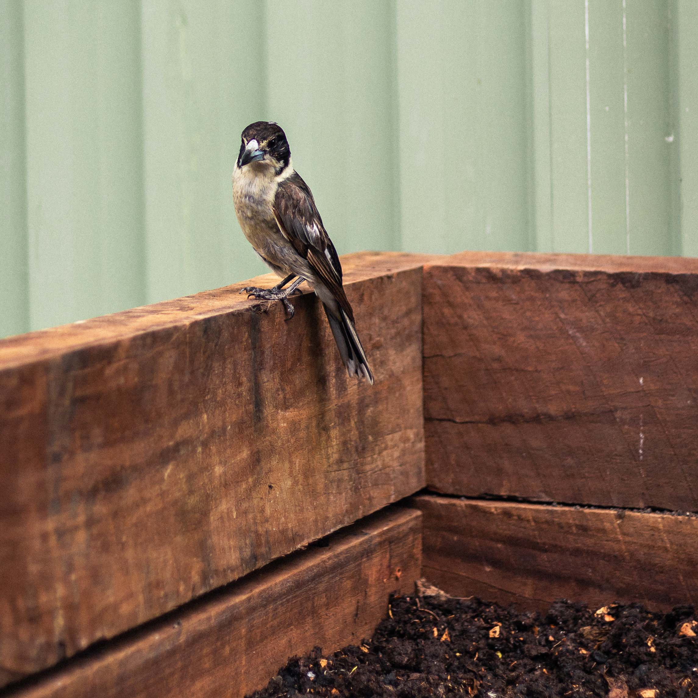 Clockwise from top left: The resident butcher bird looking for food in the new compost bin; juvenile peewee magpies; a Megachile leafcutter bee; a skink in the Plectranthus, hunting for moths. Photos: Kira Simpson.