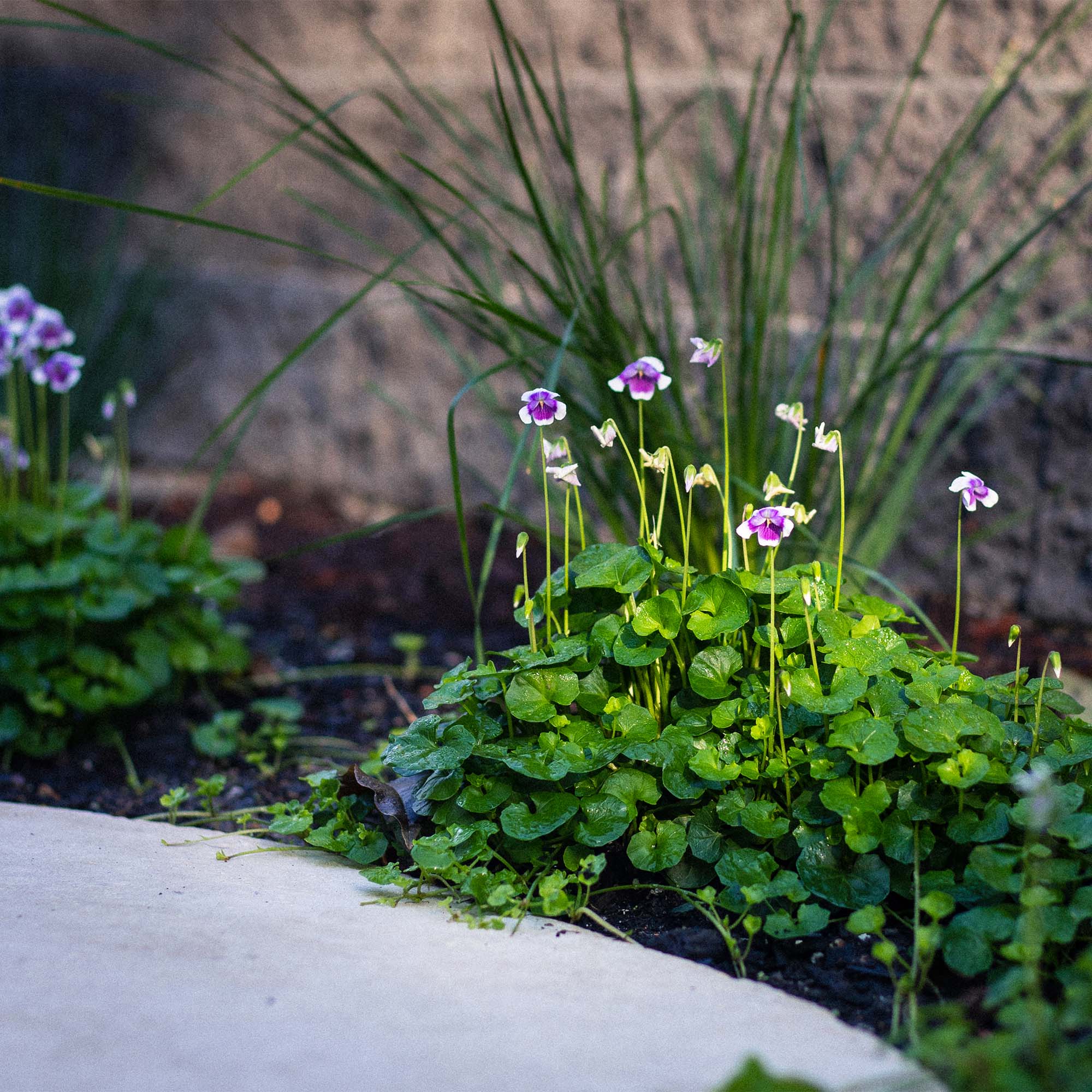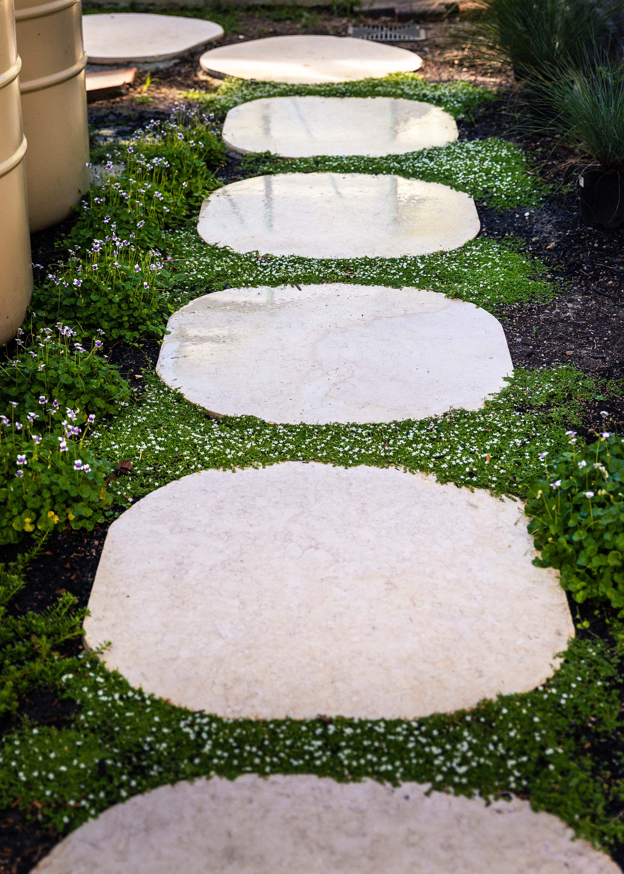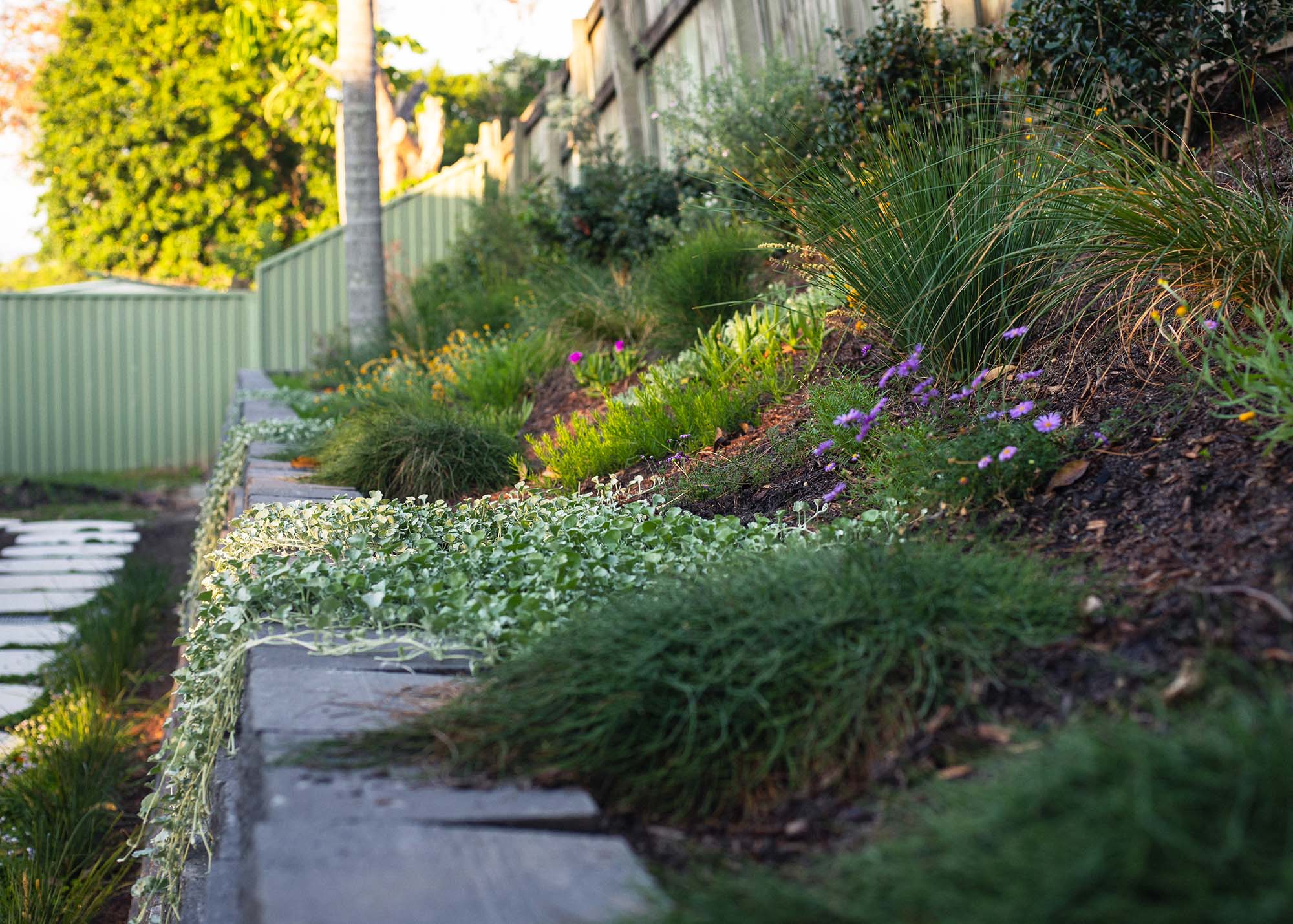 On a roll, we tackled the Corridor next – a long, narrow stretch between the house and the retaining wall where the water tanks live. It’s our main access path to the veggie garden and the area most prone to flooding, so we laid limestone steppers and planted low, hardy groundcovers: Viola hederacea and Pratia pedunculata.