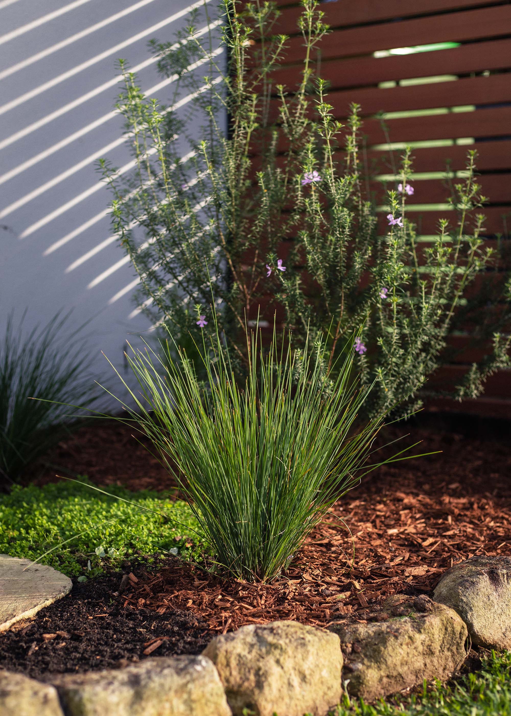 I planted two shrubby flowering natives, Westringia and Kunzea, chosen to bring in the native bees and ensure they have a reliable food source year-round. Along the ground, Dichondra repens and Viola hederacea act as living mulch, keeping the soil cool, attracting tiny insects and giving small garden skinks a food source and a safe place to hide. Then, a thick layer of tea tree mulch to help enrich the soil and draw in insects, with scattered rocks and sticks to create more of a habitat.