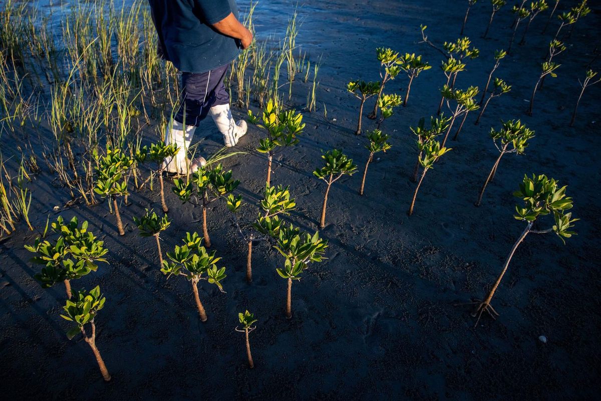 The sun sits low in the sky as David Borbón walks from one young mangrove to another, treading carefully so as not to disturb their roots. A golden glow lights the plants as he delicately checks for flowers and new growth, removing strands of dried algae and seagrass that accumulate on the saplings with the coming and going of tides. Every so often, he lets out a joyful cry upon finding a new propagule – a small, green bean–shaped seedling – growing on a tree he has planted: “My grandchild!” He takes out his phone to capture a picture of the new family member. It has taken him over a decade to get to this moment – a shoreline filled with thriving mangroves where before there was only sand – his devotion to his work unwavering.