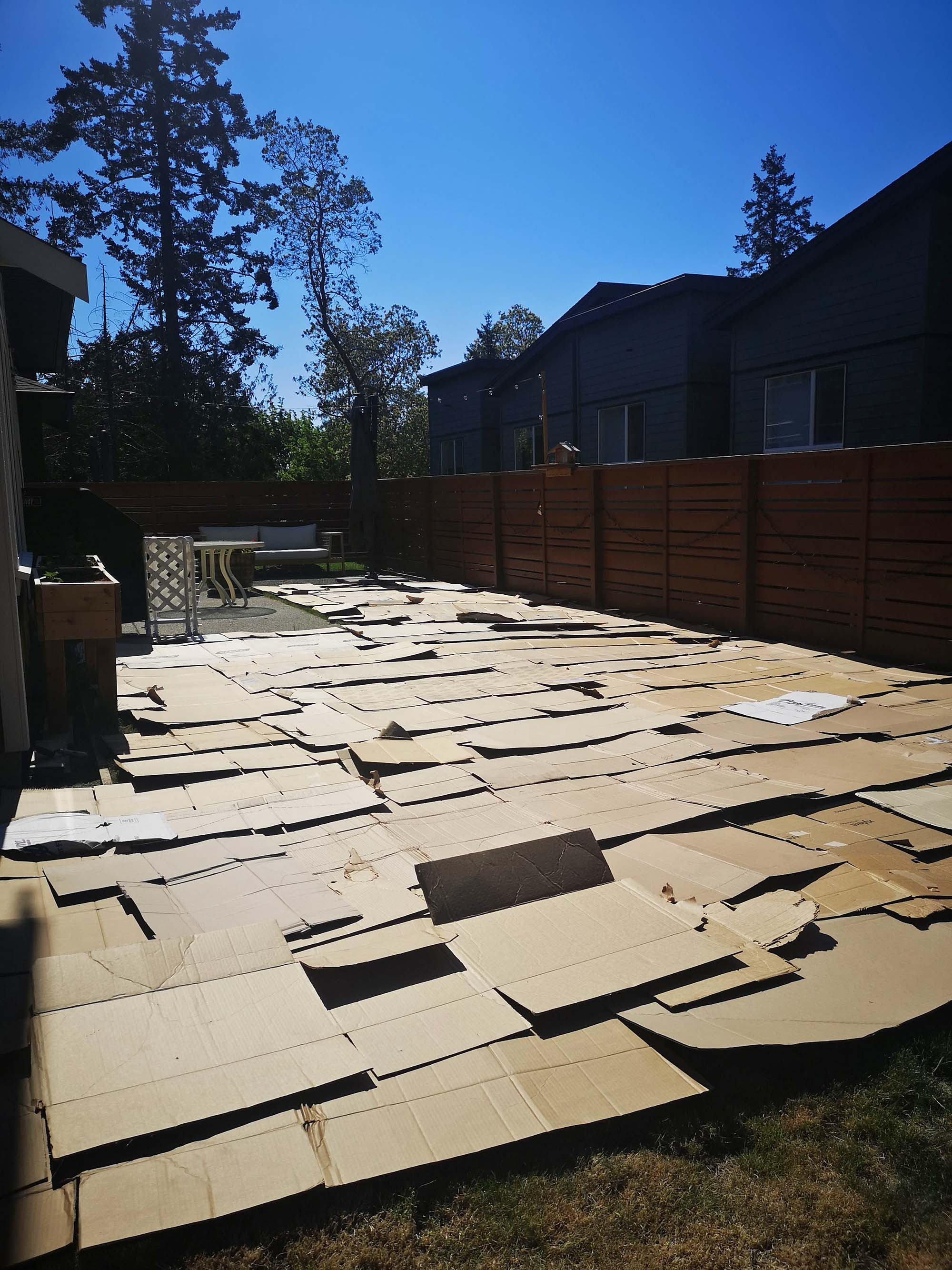 Make sure the area of lawn you want to remove is completely covered, with the cardboard overlapping enough that light can’t get through. The idea is that everything underneath the cardboard will be starved of light, and eventually the cardboard will break down too, so you won’t need to remove it.