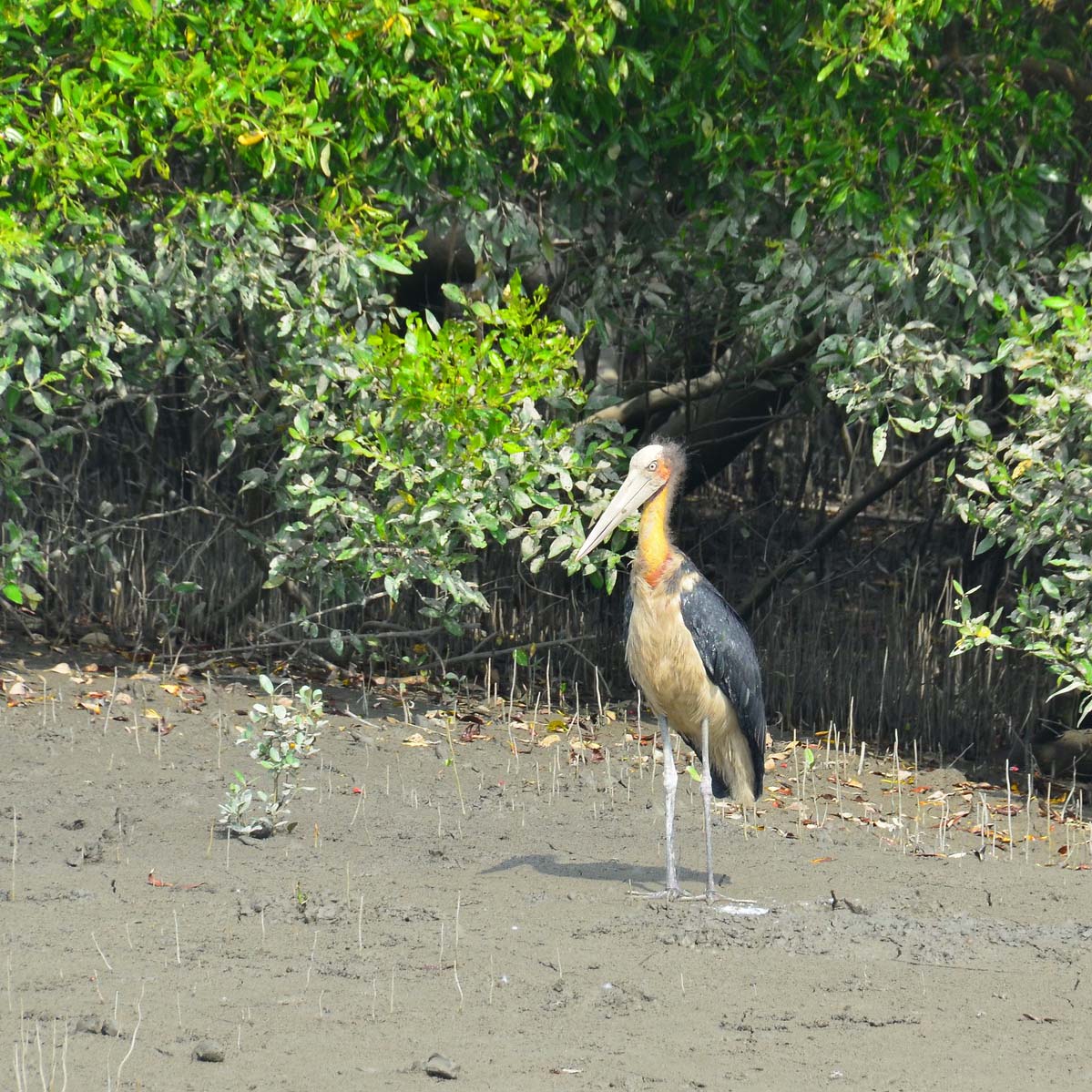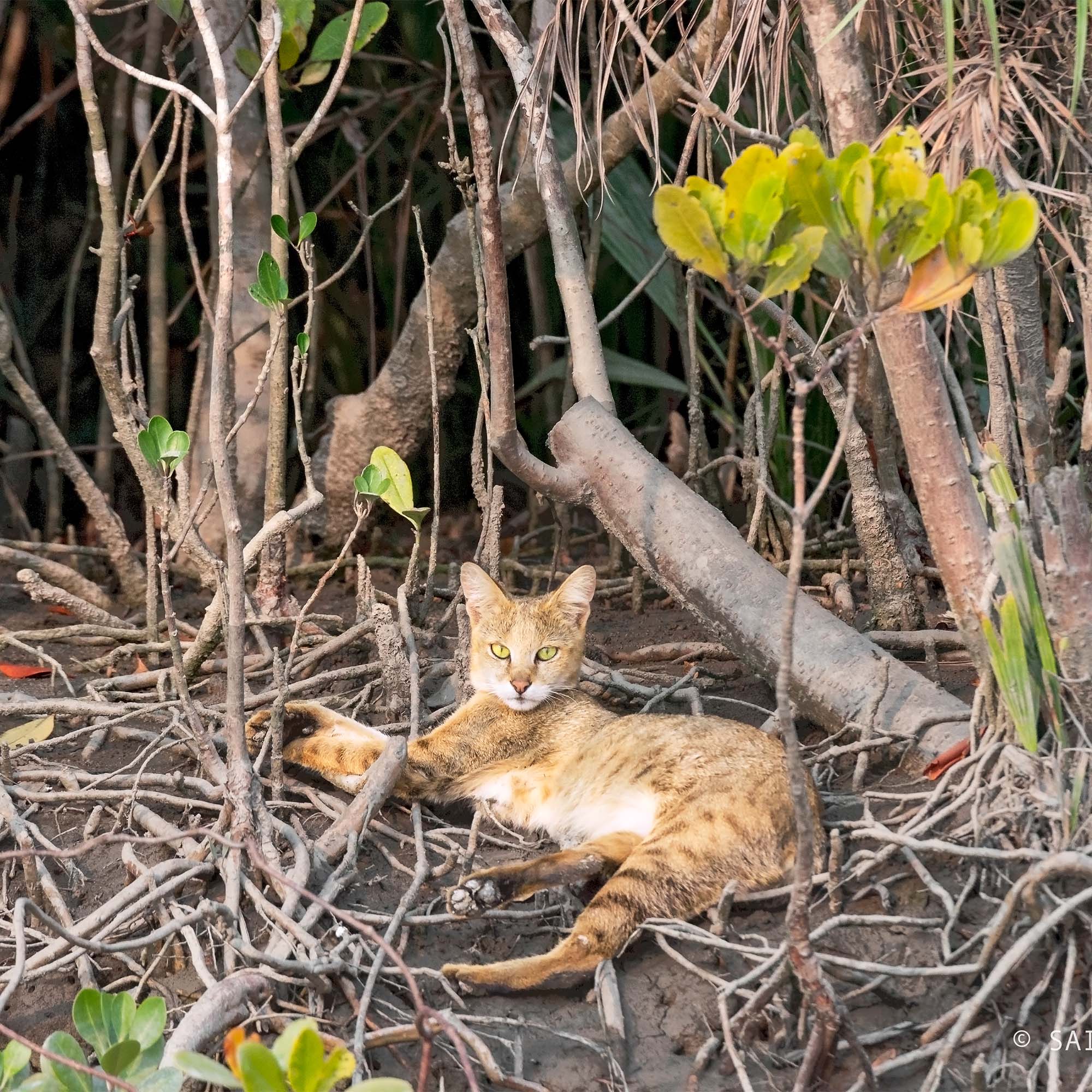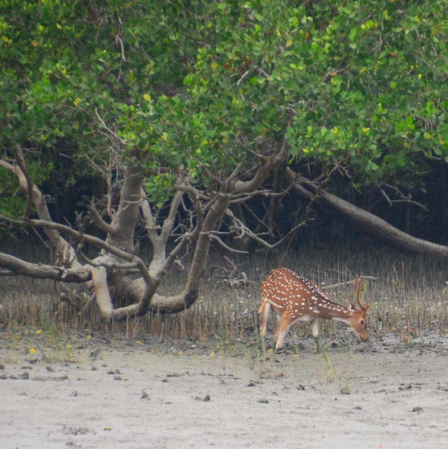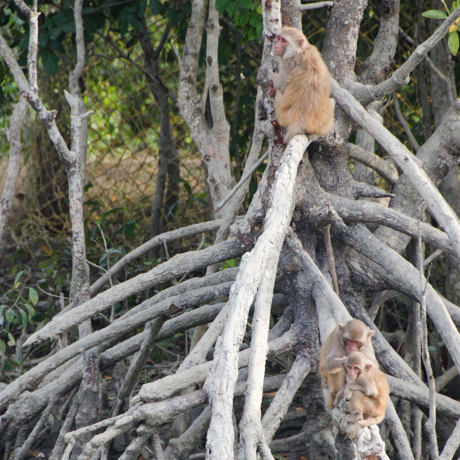 Some non-human residents of the Sunderbans mangrove forest. Clockwise from top left: a stork (photo: Matthew Stevens / Flickr); a jungle cat (photo: Sai Adikarla / Flickr); some monkeys (photo: Eric Parker / Flickr); and a spotted deer (photo: Matthew Stevens / Flickr).