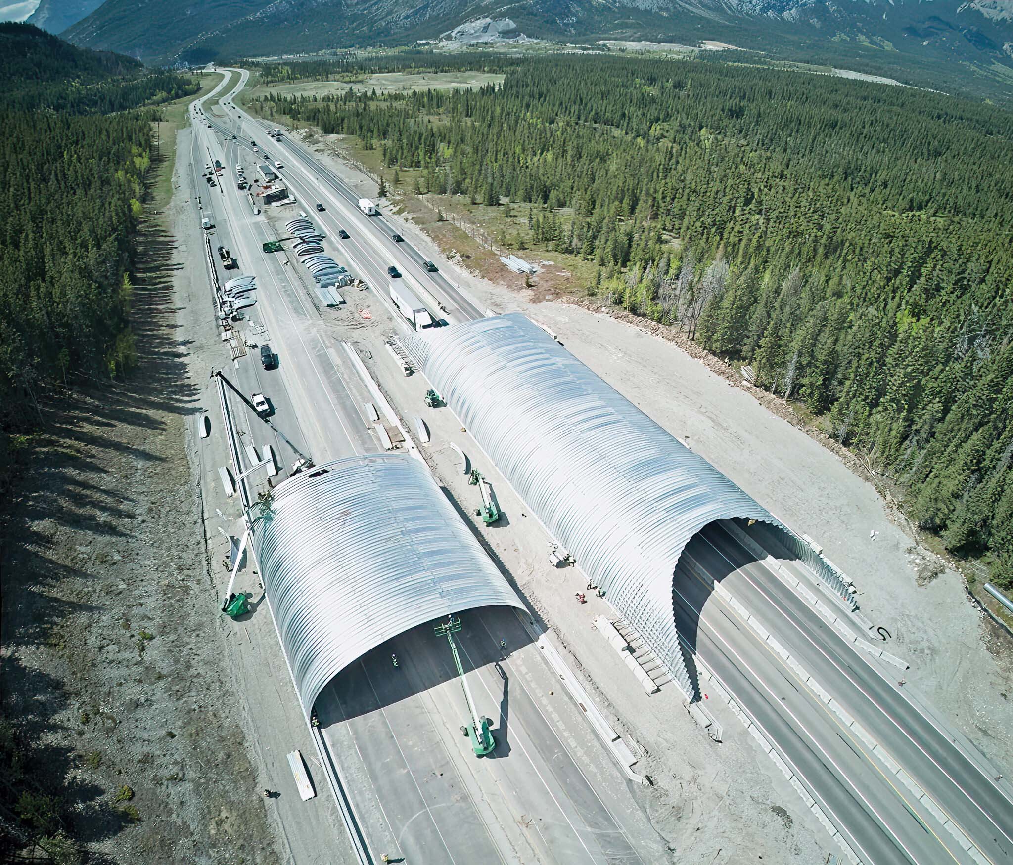 From top: 1. Aerial view of construction of the Bow Valley Gap wildlife overpass in 2023 just east of Banff National Park. Photo courtesy AIL. 2. The double-barrel design for a typical wildlife overpass in Banff National Park. Photo: Adam Linnard. 3. A wildlife underpass east of Banff National Park near Dead Man’s Flats, Alta. Photo: Adam Linnard.